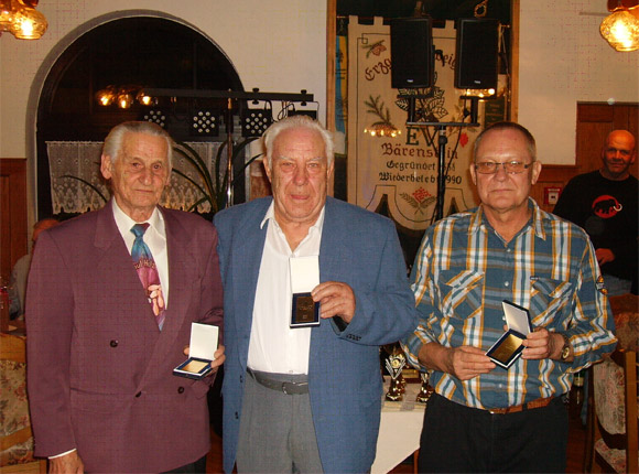 Für Ihre Jahrzehnte lange Treue zum Kegelsport, den Sie in Bärenstein als Abteilungssport aus der Taufe gehoben haben und diesen maßgeblich beeinflussten erhielten die Spfrdn. Marianne Hammer, die Spfrd. Herbert Hammer und Ernst Bartl die Ehrenplakette des Landessportbund Sachsen. Es ist die höchste Einzelauszeichnung an Personen die der Sportbund zu vergeben hat. Die Übergabe der Plaketten durch die Spfrd. Markus Gundermann (Vertreter des KSB) und Uwe Hammer (1. Vorsitzender) war für beide Seiten ein emotionaler Moment. Mit feuchten Augen nahmen die Spfrd. Herbert Hammer und Ernst Bartl Ihre Auszeichnung entgegen. Für die leider erkrankte Spfrd. Marianne Hammer, nahm Ihr Sohn Gert Hammer die Auszeichnung entgegen.
