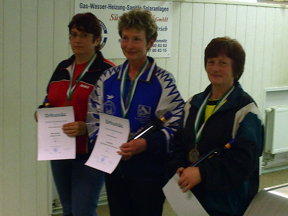 Die Medaillengewinnerinnen der Seniorinnen A: Elke Lerche (Lößnitzer SV 1847, 2.), Karin Zahn (KSV Blau-Weiß Lumpen 1896 Cranzahl, 1.) und Gisela Ullmann (SV Leukersdorf, 3.), v.l.n.r.. Foto: André Eidenschink