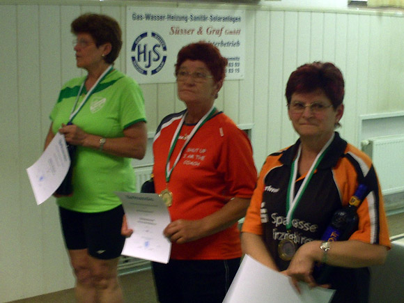Die Medaillengewinnerinnen der Seniorinnen B: Heidrun Gerschler (Chemnitzer SV Siegmar 48, 2.), Christa Brendel (SG Grün-Weiß Mehltheuer, 1.) und Regina Lauks (SV Neuoelsnitz/E., 3.), v.l.n.r.. Foto: André Eidenschink