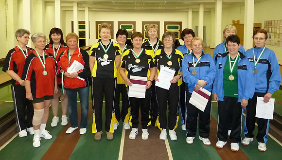 Die drei Siegermannschaften der Bezirksvereinsmannschaftsmeisterschaften 2011 bei den Seniorinnen in Freiberg: ESV Lokomotive Chemnitz (2.) - SKV Auerbach/V. (1.) und TSV Fortschritt Mittweida 1949 (3.) - v.l.n.r.. Foto: W. Wüstling