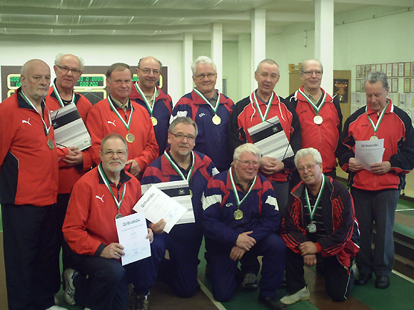 Die drei Siegermannschaften der Bezirksvereinsmannschaftsmeisterschaften 2011 bei den Senioren B in Freiberg: TSV 90 Zwickau (3.) - TSV Fortschritt Mittweida 1949 (1.) und ESV Lokomotive Chemnitz (3.) - v.l.n.r.. Foto: W. Wüstling