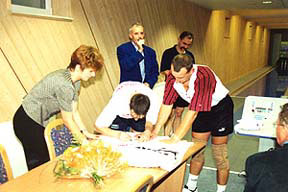 Die Ex-Weltmeister Sven Tränkler und Andreas Kühn signieren das Trikot der Nationalmannschaft unter der "Anleitung" ihres Trainers.